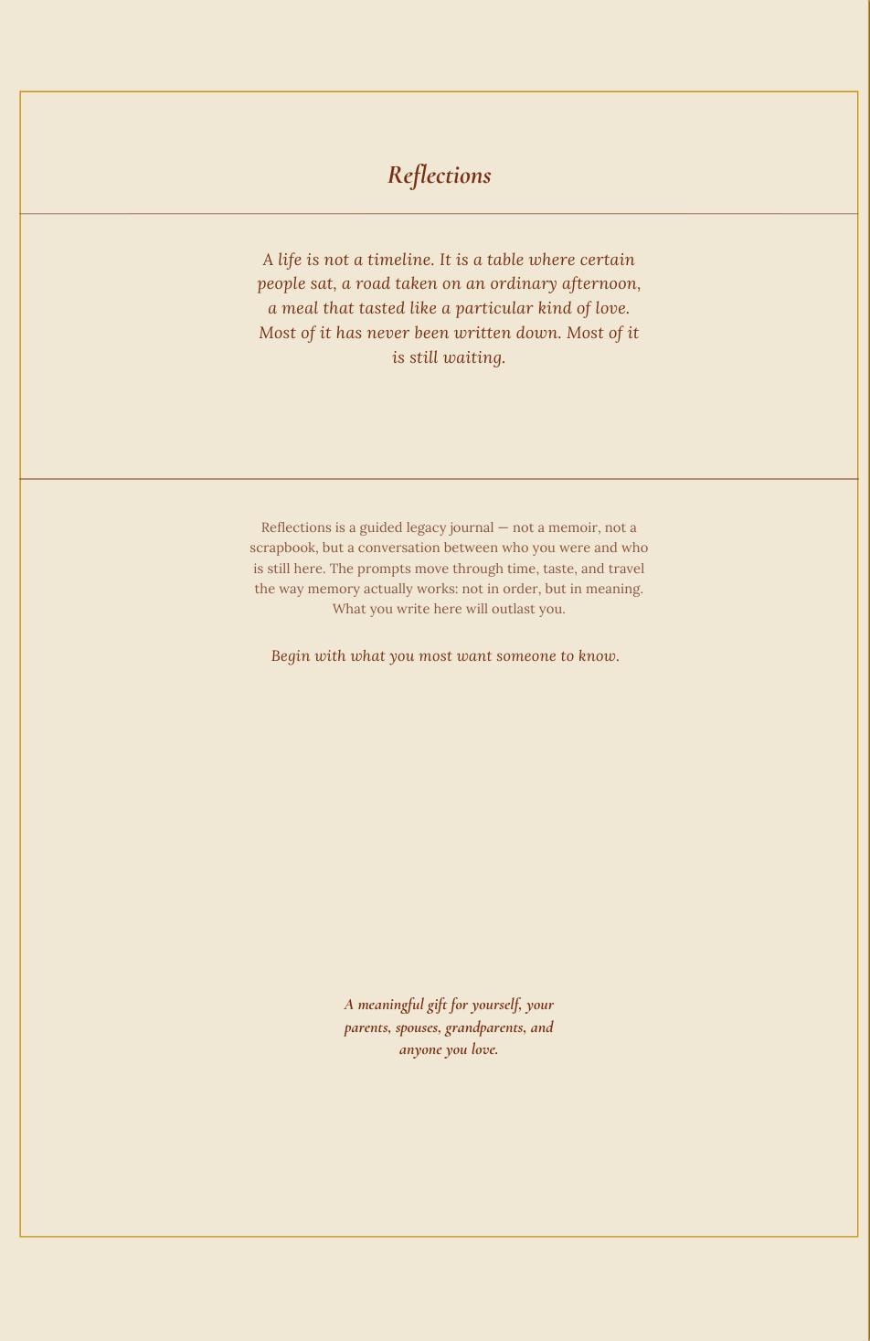 Reflections: On Time, Taste & Travel is a guided journal for adults who have lived enough to have something worth saying — and the people in their lives who would give anything to hear it.