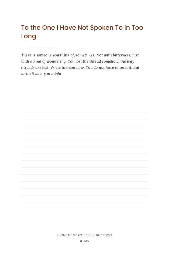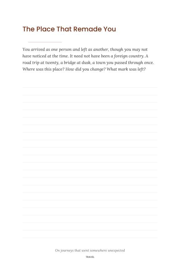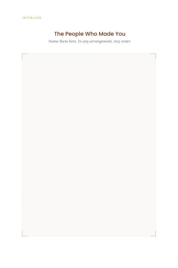 This isn't a diary. It isn't a questionnaire. It's 54 carefully written prompts across three themes — the years that shaped you, the meals you still remember, the places that changed you — each one asking for a specific memory, a particular moment, a single person who mattered.