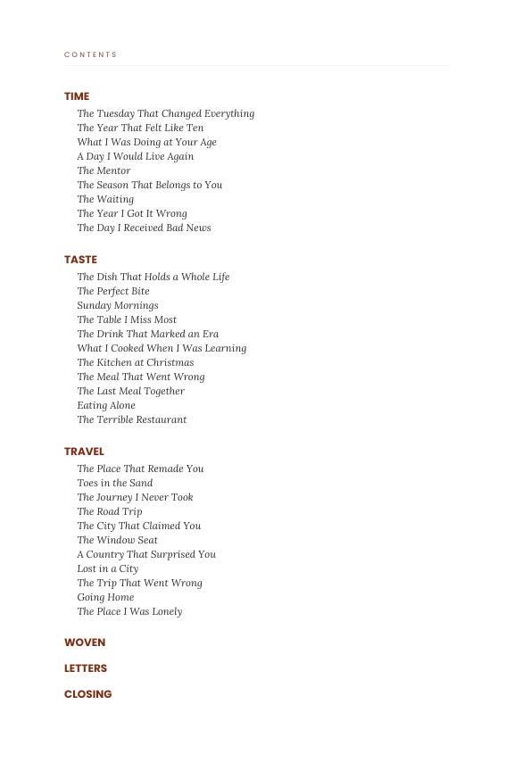 54 spreads across Time, Taste & Travel — woven together the way memory actually works, not in chronological order. Letter pages addressed to specific loved ones. Breathing spreads with a single sentence and generous white space. Shadow prompts for the hard years, the trips that humbled you, the meals that went wrong — because a full life contains all of it.