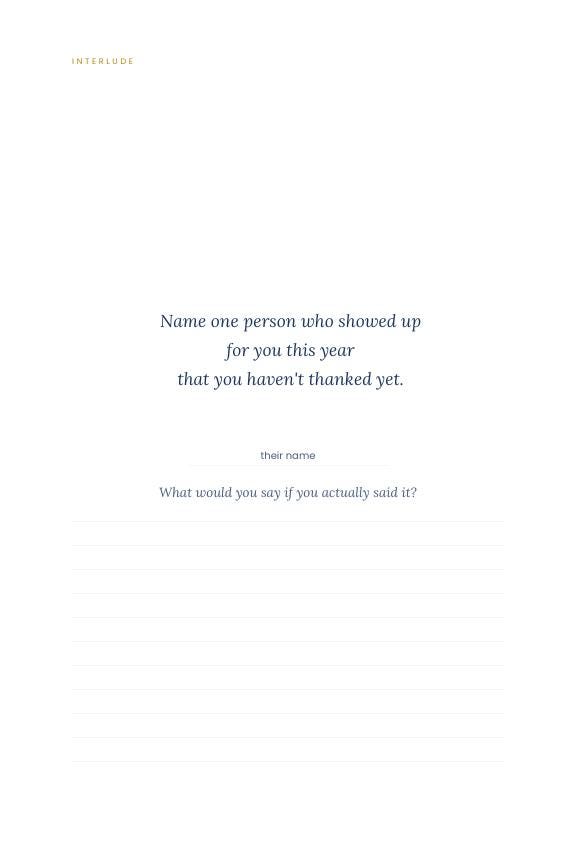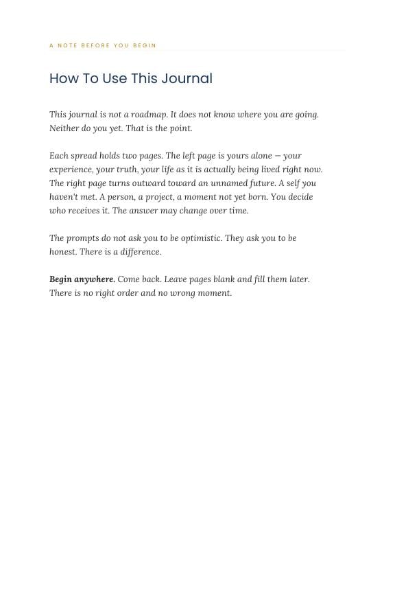 The left page is yours alone. The right page asks you to go one step further — not toward a future self who has it figured out, but toward whoever you are in the process of becoming.