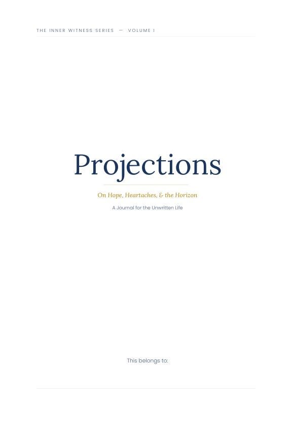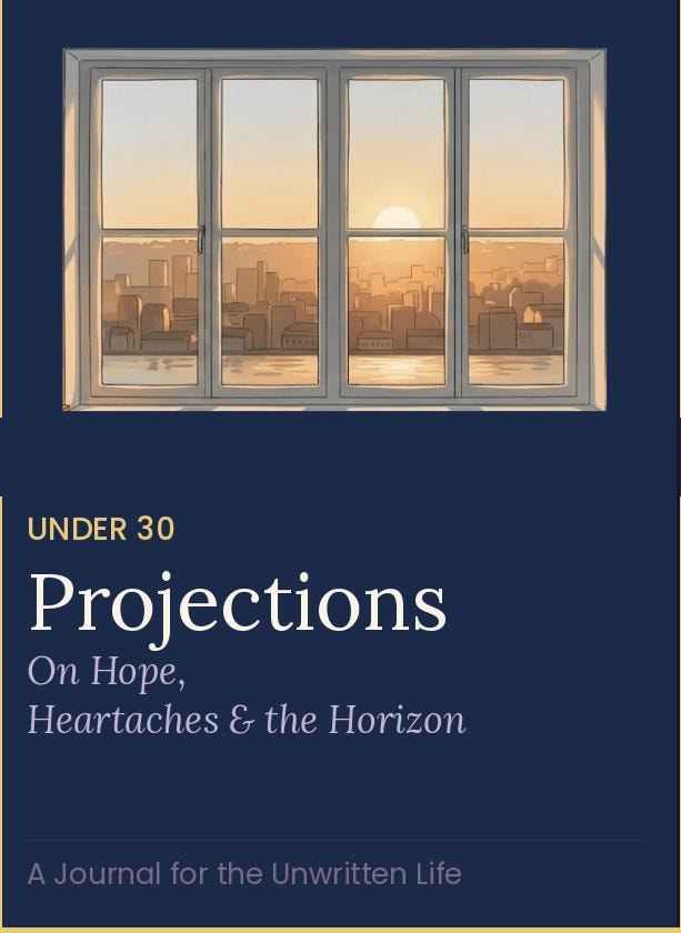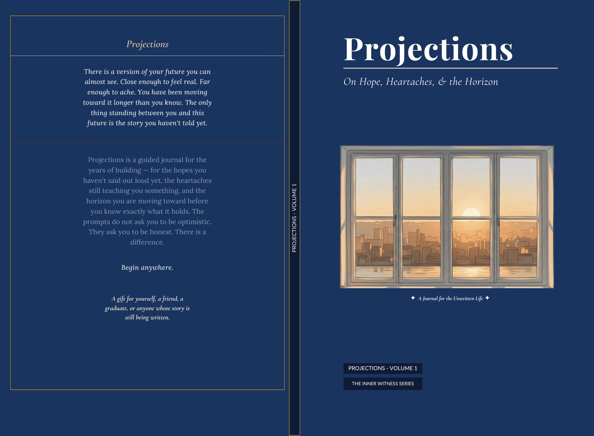 Projections: On Hope, Heartaches & the Horizon is a guided journal for young adults who are still becoming — navigating early love, early loss, early decisions that feel larger than they should. Not a planner. Not a five-year roadmap. A set of 54 carefully written prompts that ask for one honest thing at a time — a specific memory, a particular person, a moment that shifted everything.