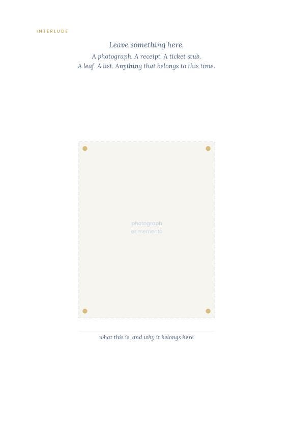 54 spreads across the territory of the unwritten life — hope that is still forming, heartaches that haven't fully resolved, and a horizon that keeps moving. The prompts are specific, not sweeping. They don't ask you to reflect on your life in general — they ask about one afternoon, one friendship, one thing you did that surprised you. Woven throughout are the harder ones too, because a life in the making contains all of it.