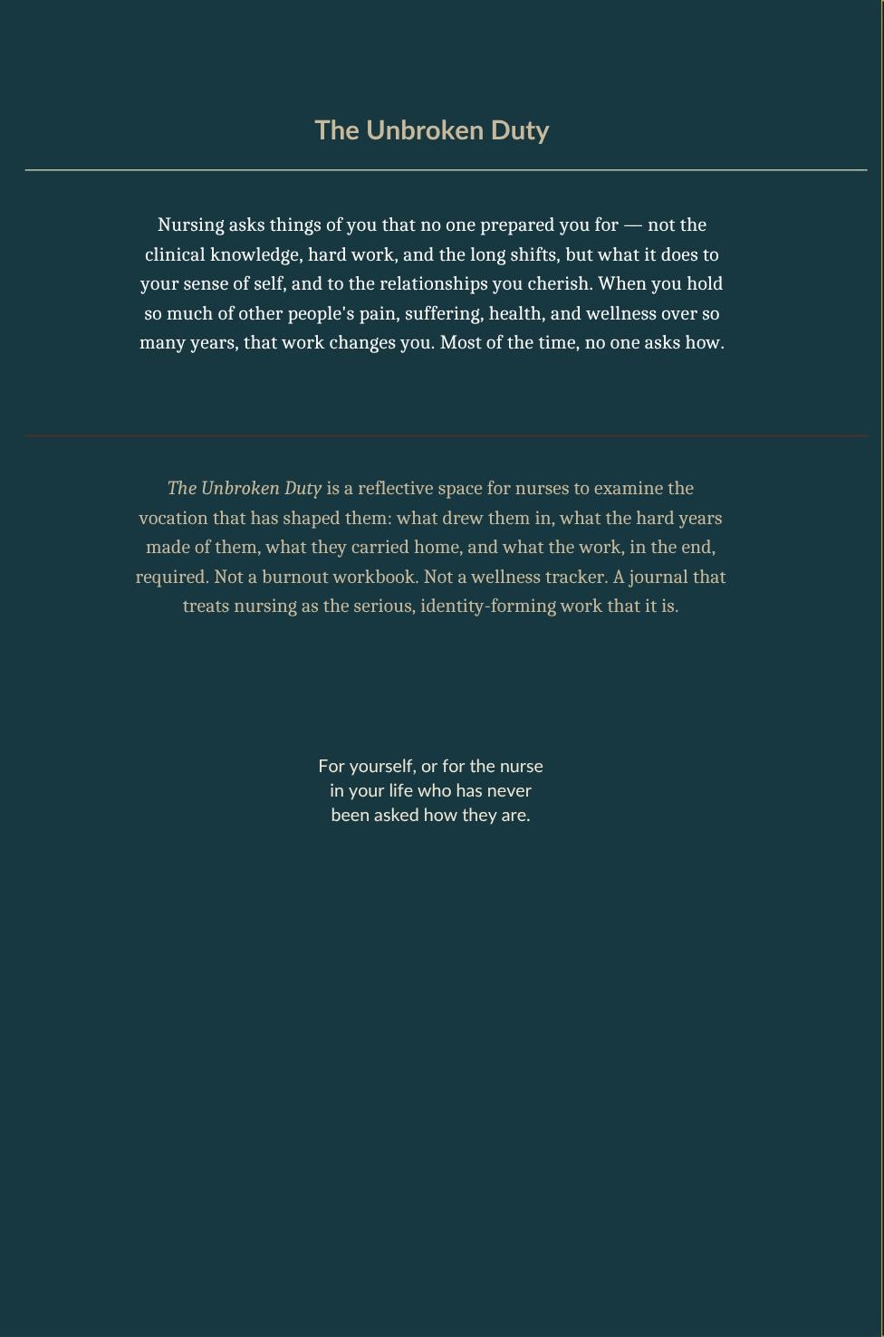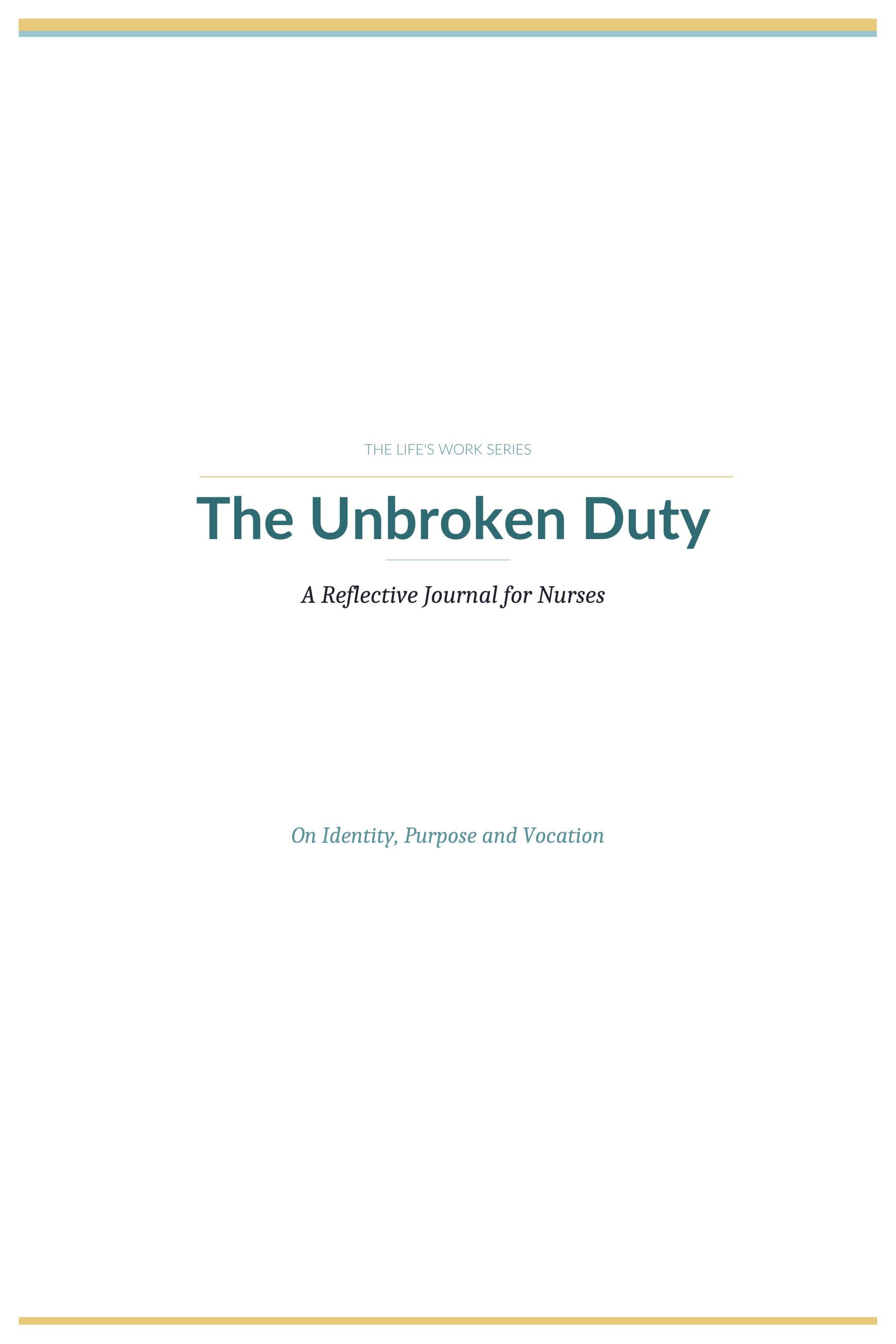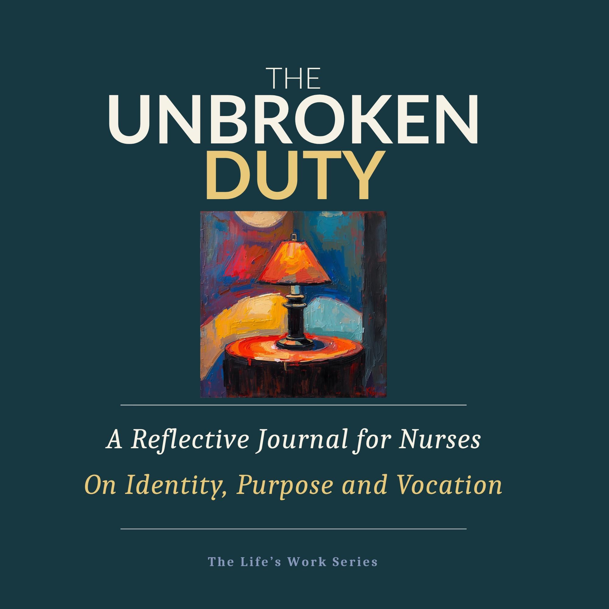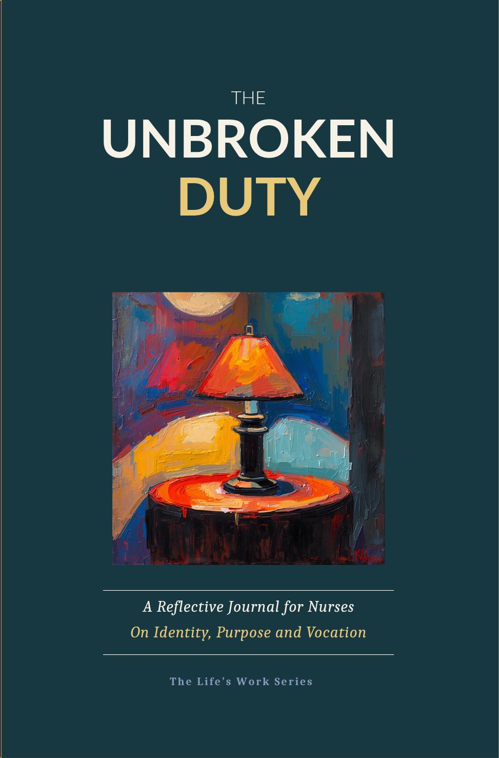 THE UNBROKEN DUTY is a reflective journal for nurses on the full arc of a nursing life — the calling that brought you here, the weight the work places on you, the patients and colleagues who shaped you, the crossroads you have navigated, the craft you have built across years of practice, and the questions about legacy you are still carrying.