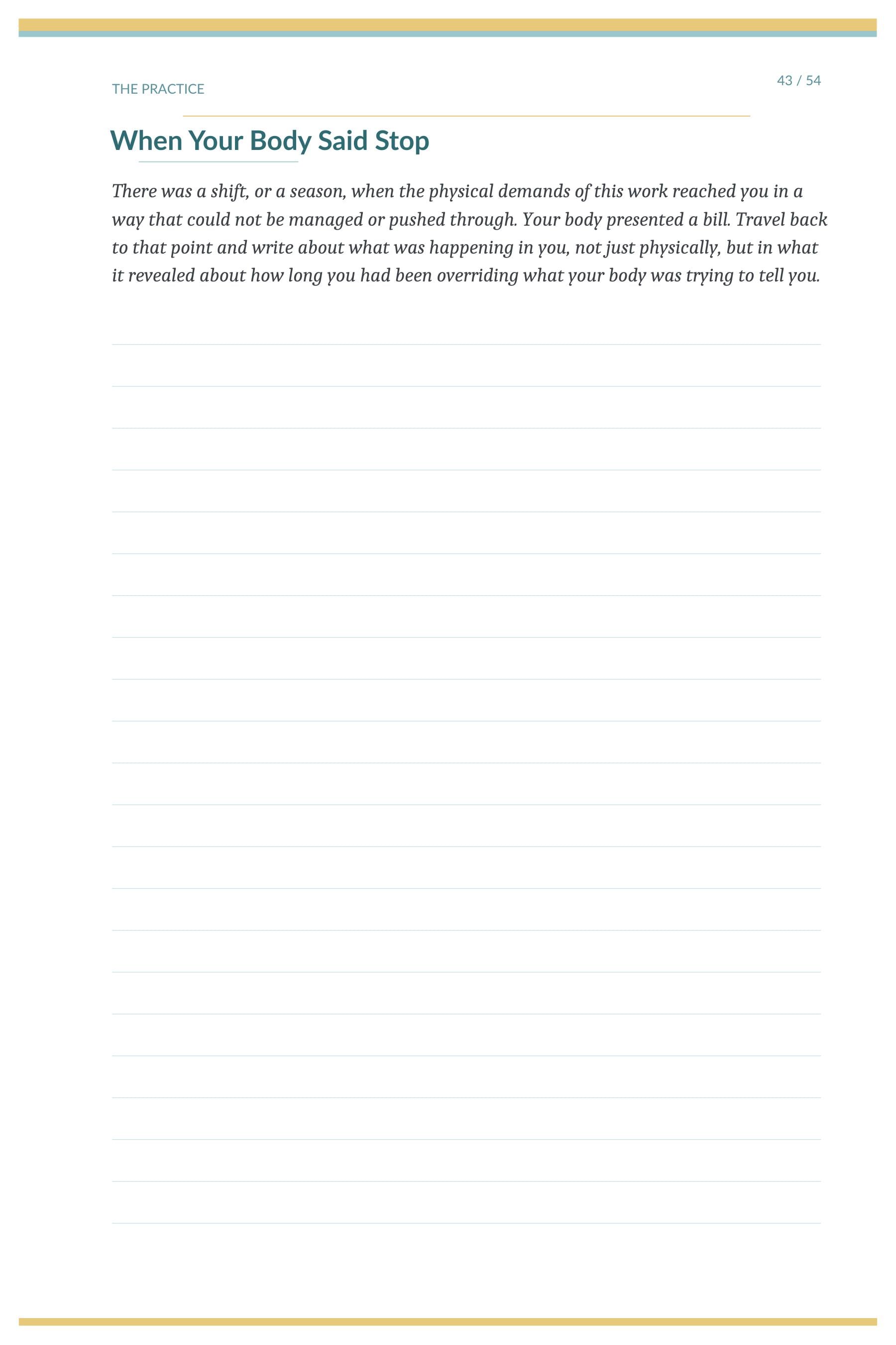 → 54 guided prompt spreads across six sections: The Calling, The Weight, The People, The Crossroads, The Practice, and The Horizon