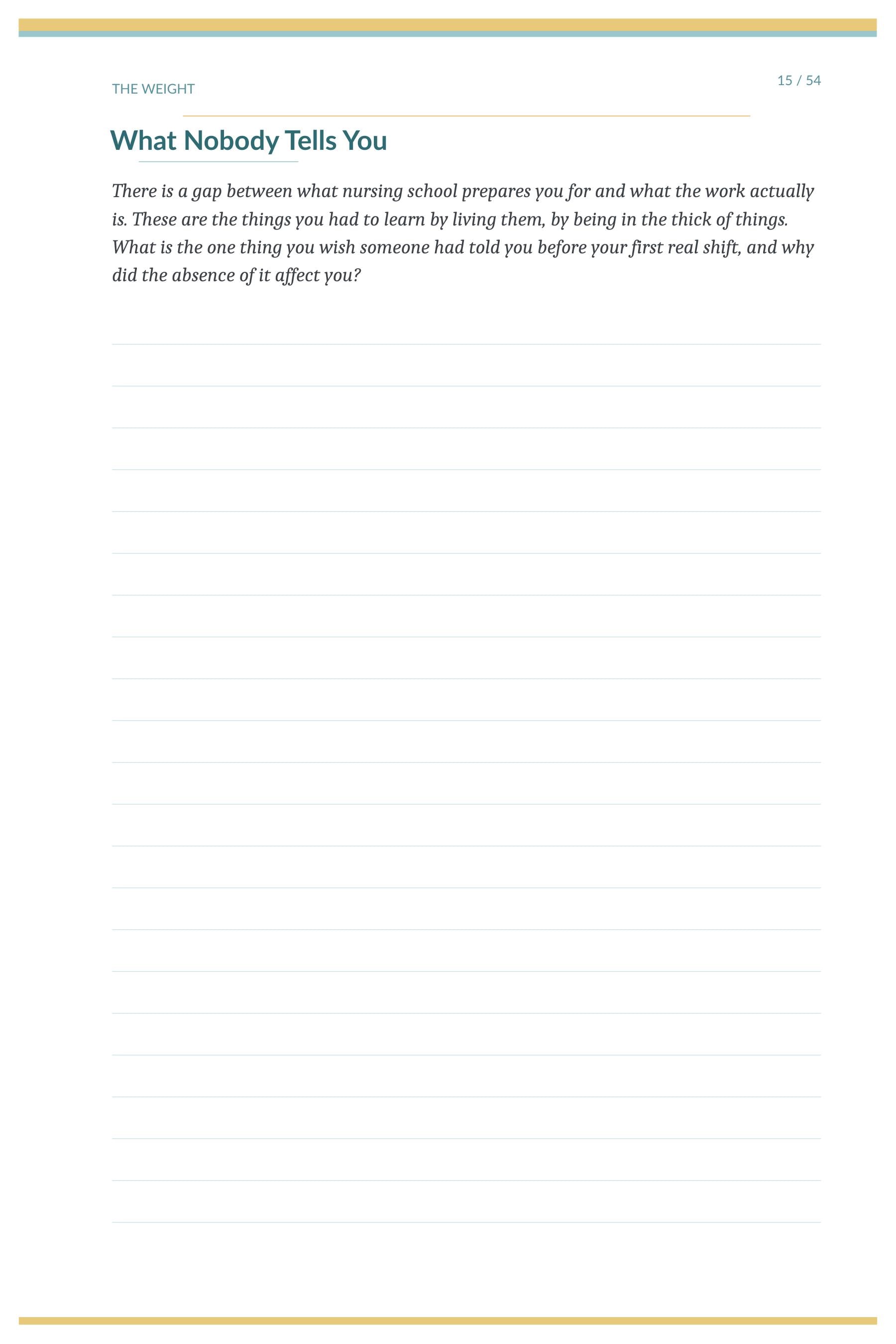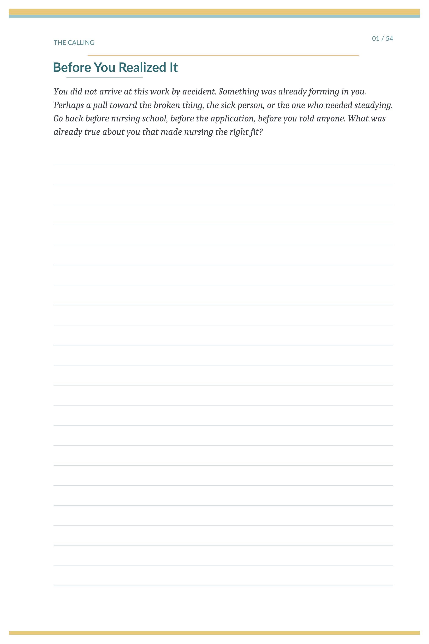 This is not a burnout journal. It is not a resilience workbook. It is a place for the nurse in your life — or in yourself — to witness their own professional life with the same attention they bring to their patients.