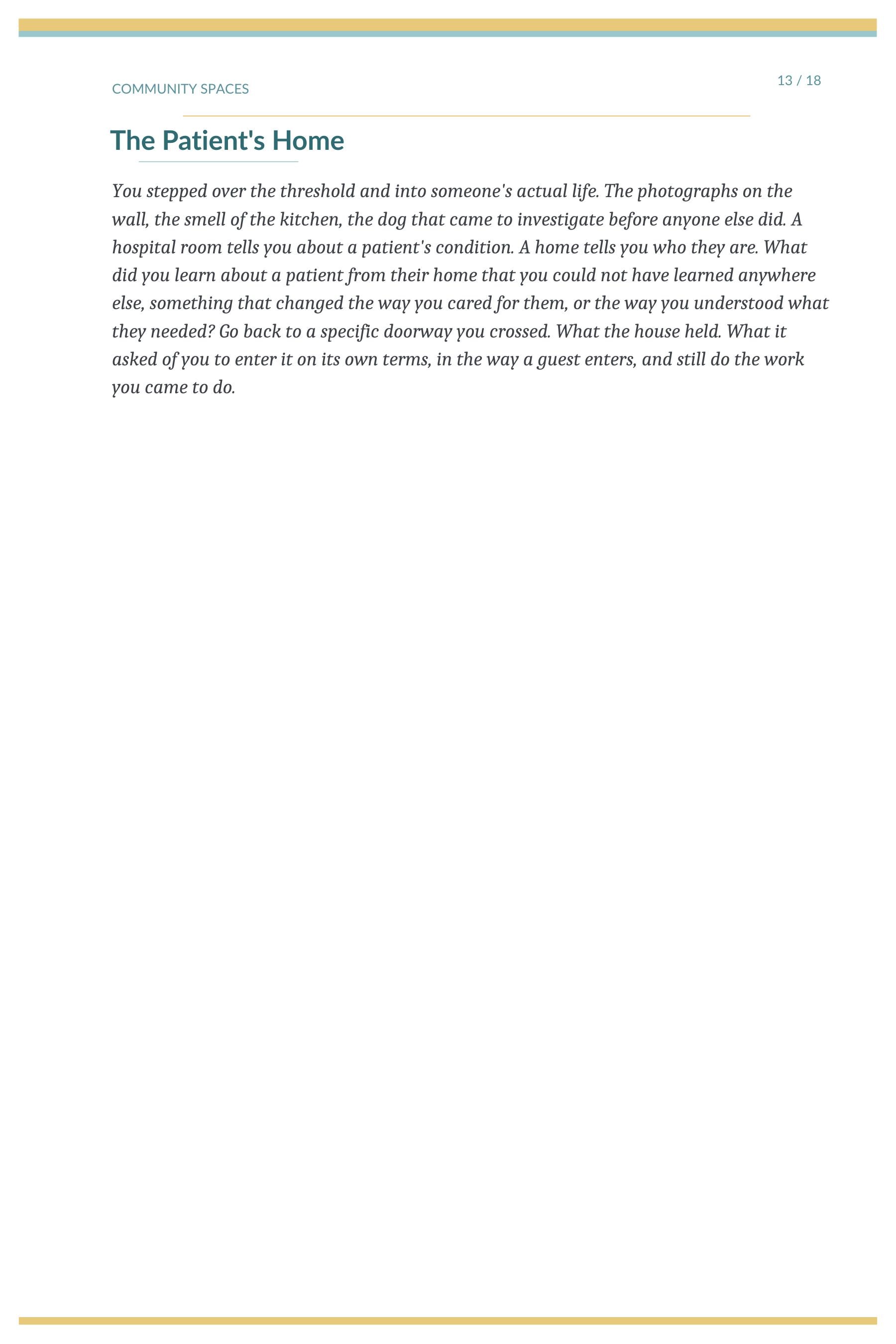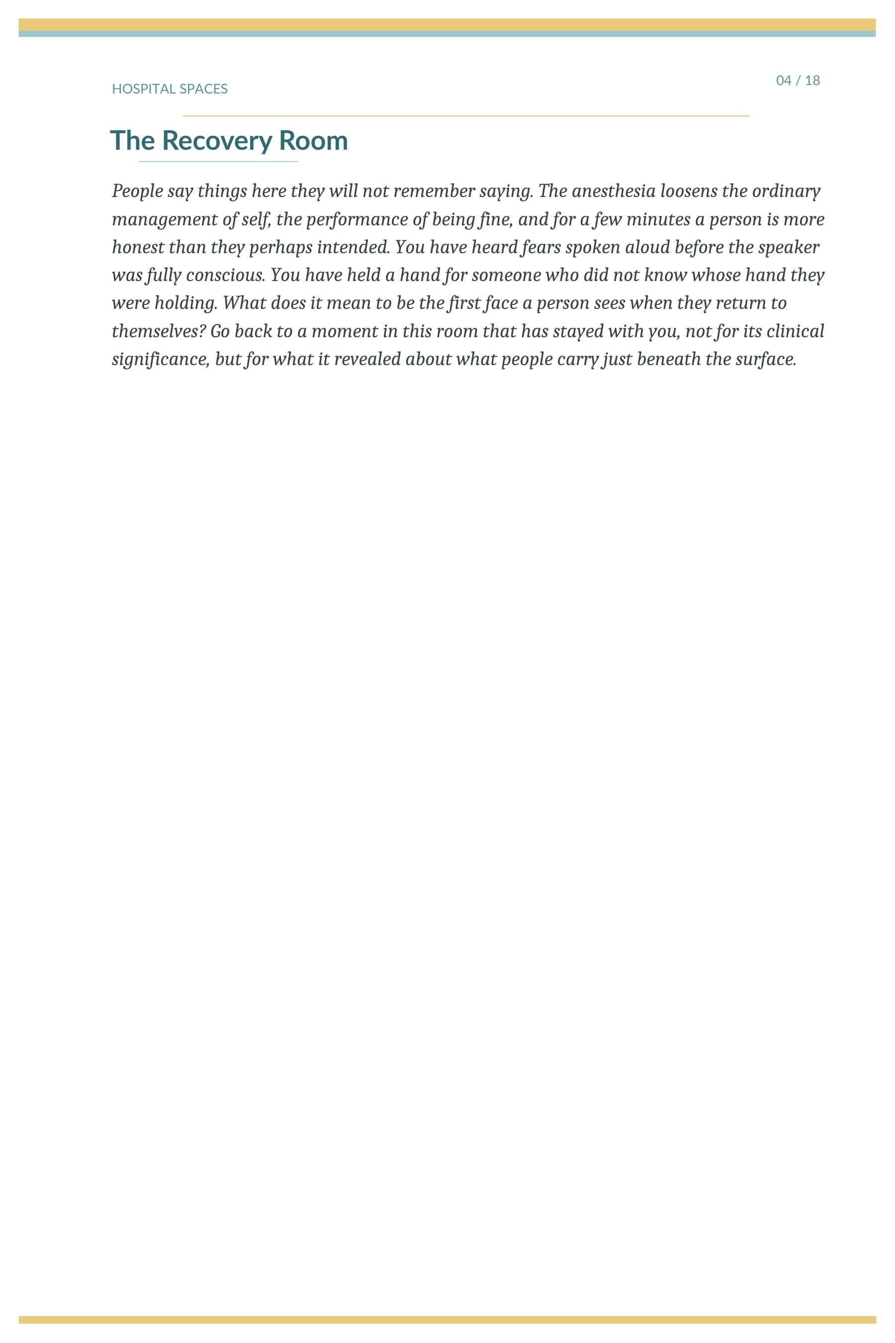 → Interlude pages honoring the spaces nurses inhabit — the ICU, the break room, the parking lot at end of shift, the patient's home