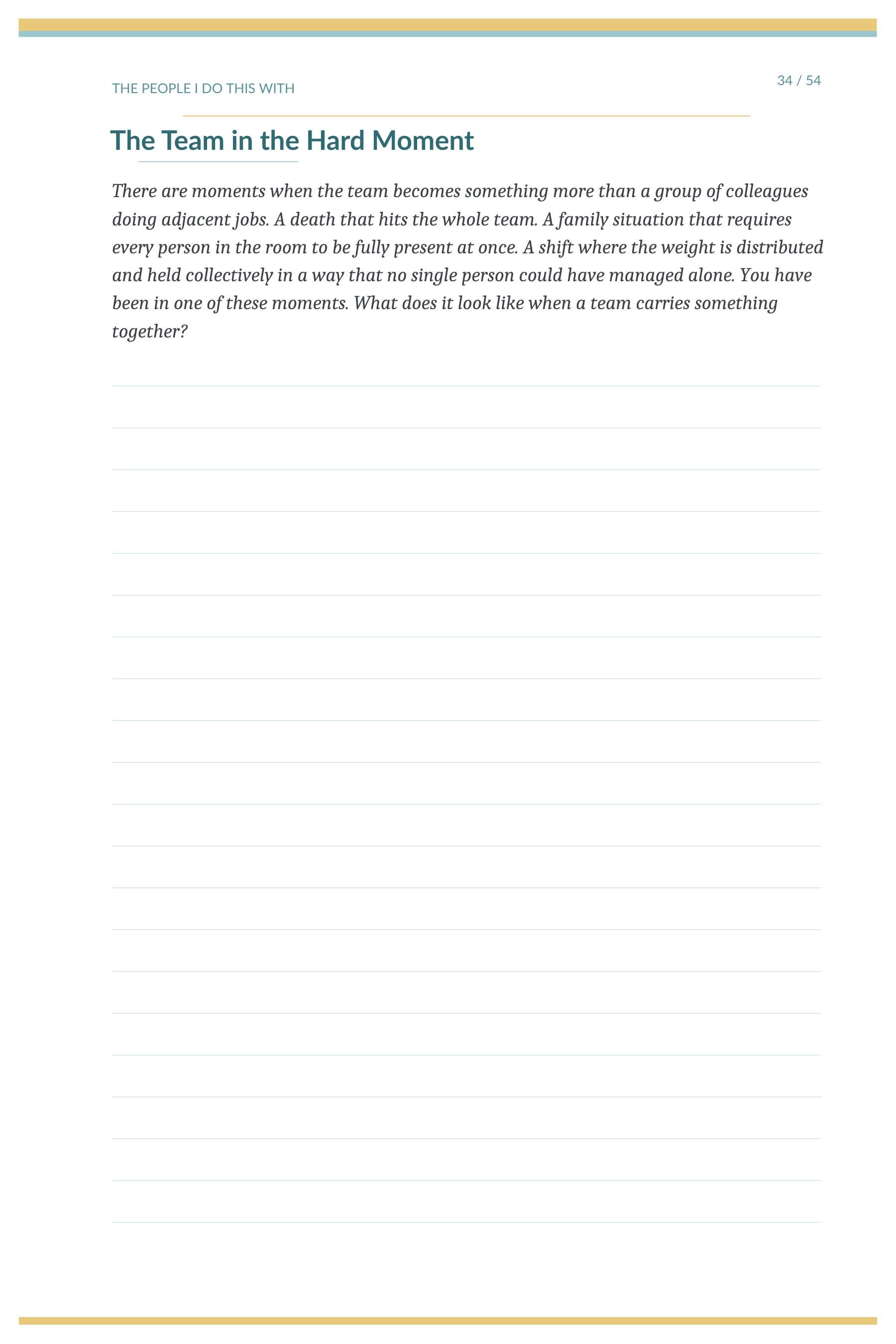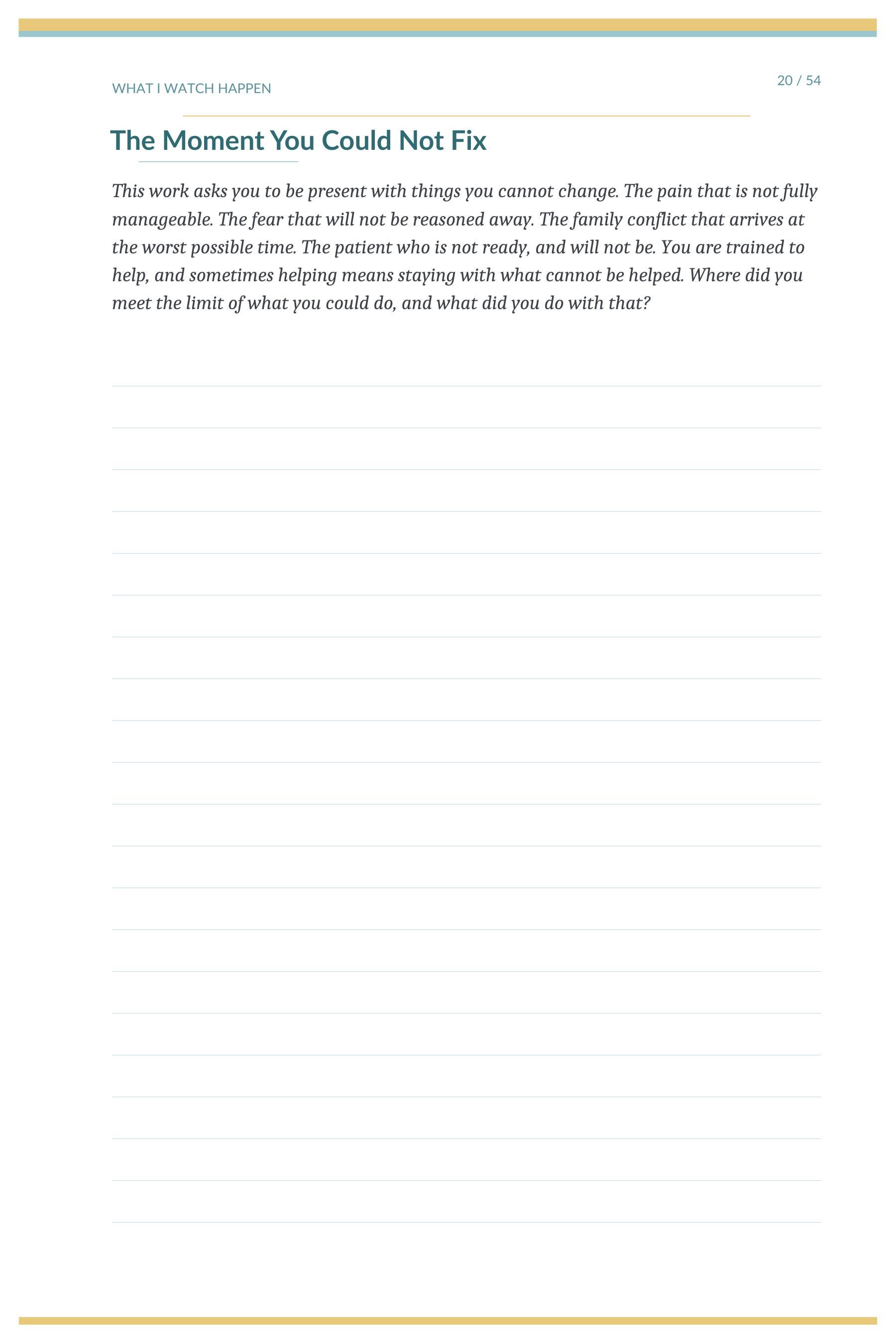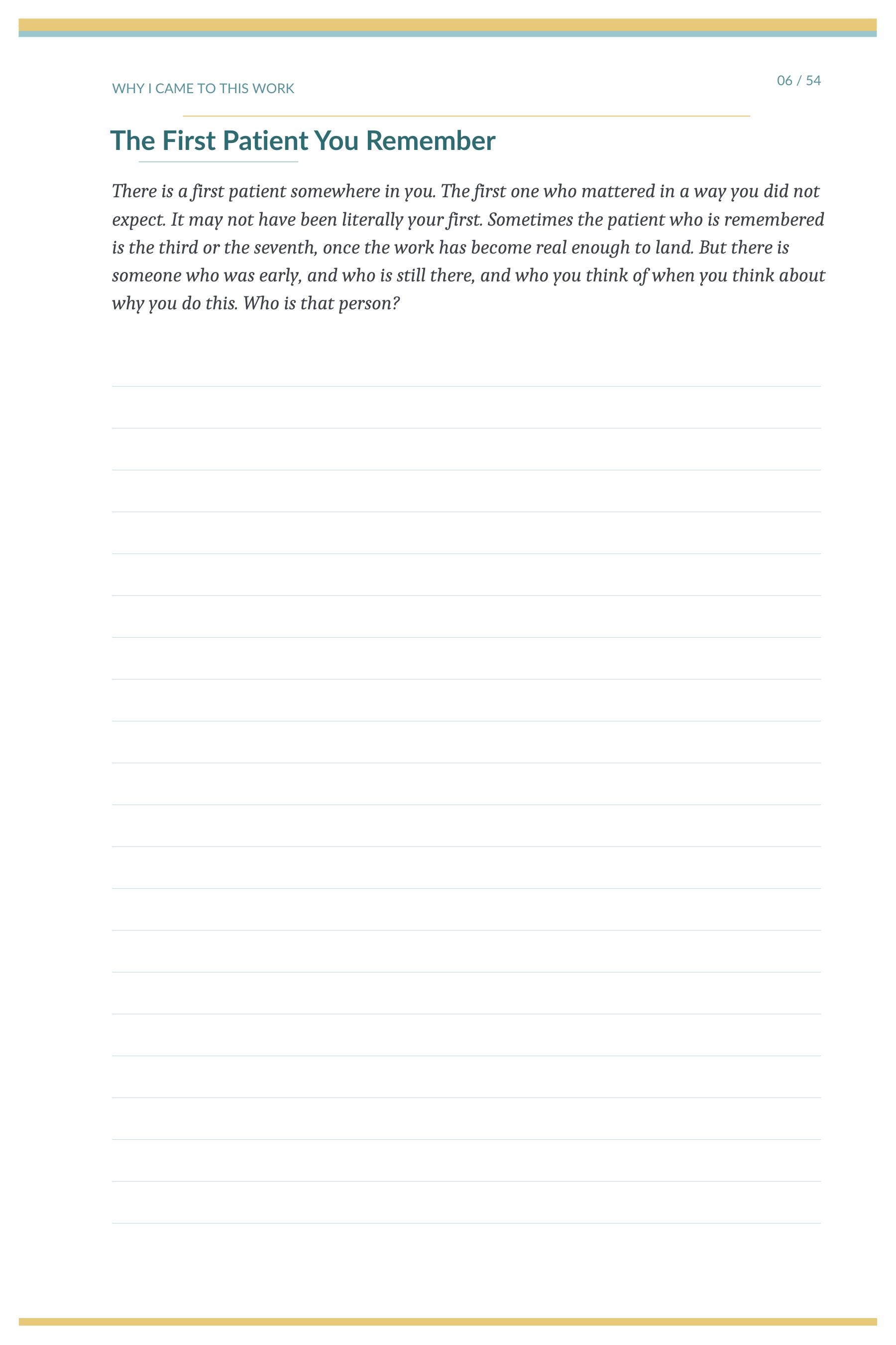 → 54 guided prompt spreads across seven sections: Why I Came to This Work, The