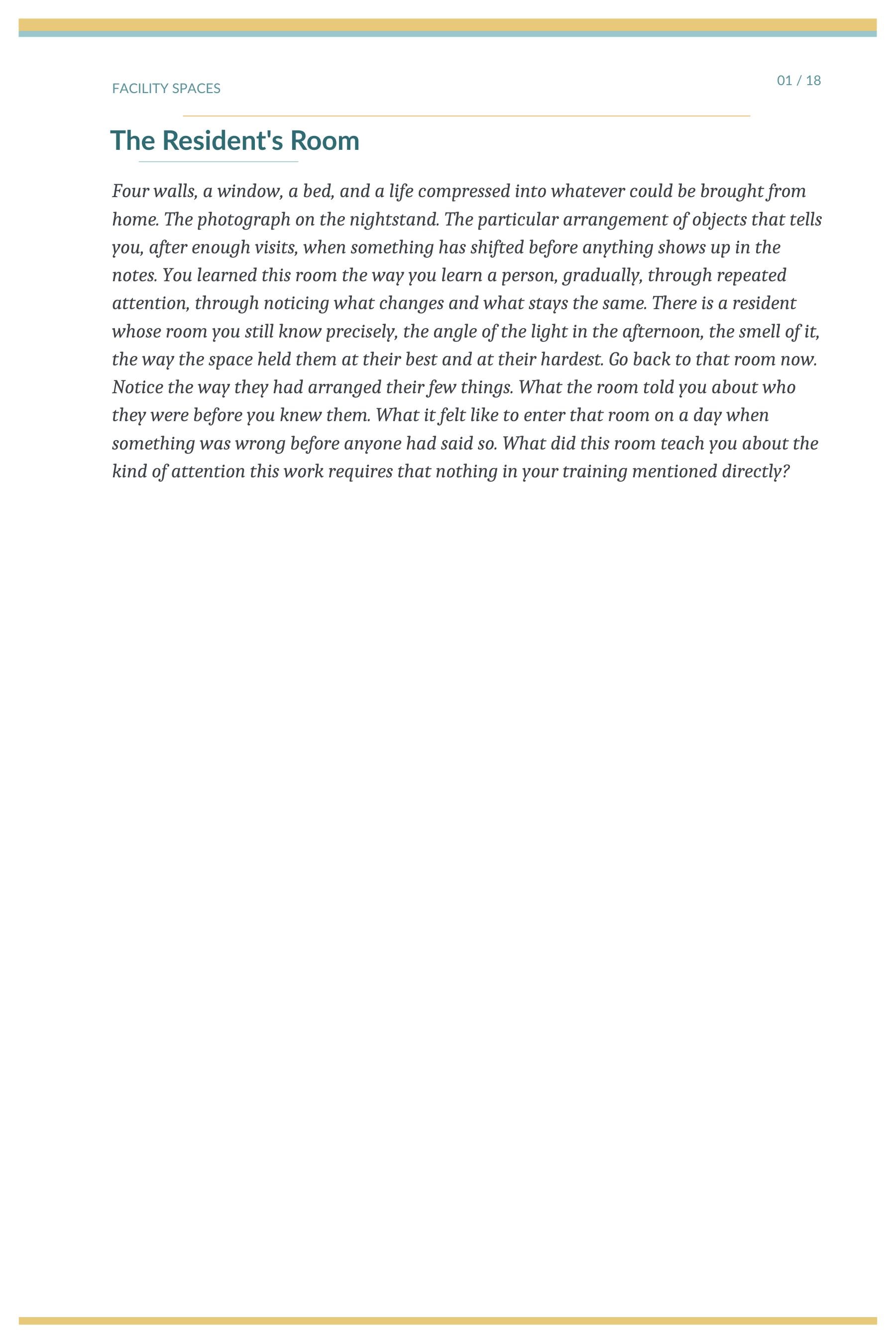 → 12 interlude pages honoring the spaces of this work — the resident's room, the